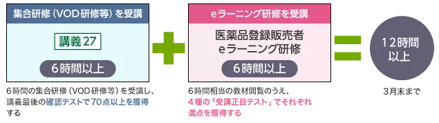 弊社では、毎年3月末を1年間の区切りとしております(開始は毎年4月)。そのため、厚生労働省より発出された「登録販売者に対する研修の実施要領について」で示された年間12時間以上の研修は、毎年3月末までに受講、修了いただく必要がございます。4月からは新年度の外部研修となりますので、ご注意ください。